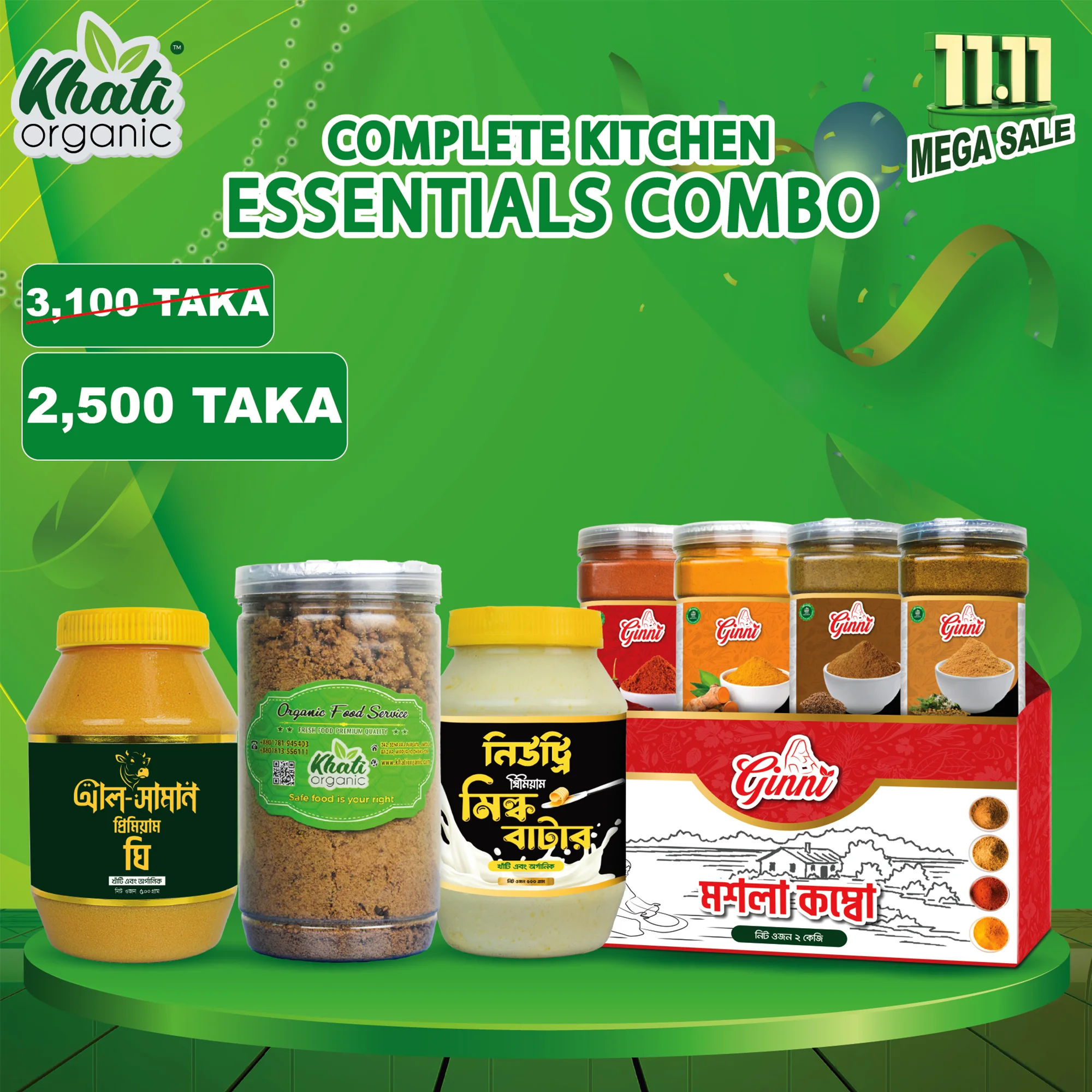 ১১.১১ মেগা সেল উপলক্ষে আমরা এনেছি আপনার রান্নাঘরের জন্য বিশেষভাবে তৈরি সম্পূর্ণ কিচেন এসেনশিয়ালস কম্বো! এই কম্বোতে রয়েছে প্রিমিয়াম মানের পণ্য যা আপনার রান্নার স্বাদ এবং মানকে আরো বাড়িয়ে তুলবে:
